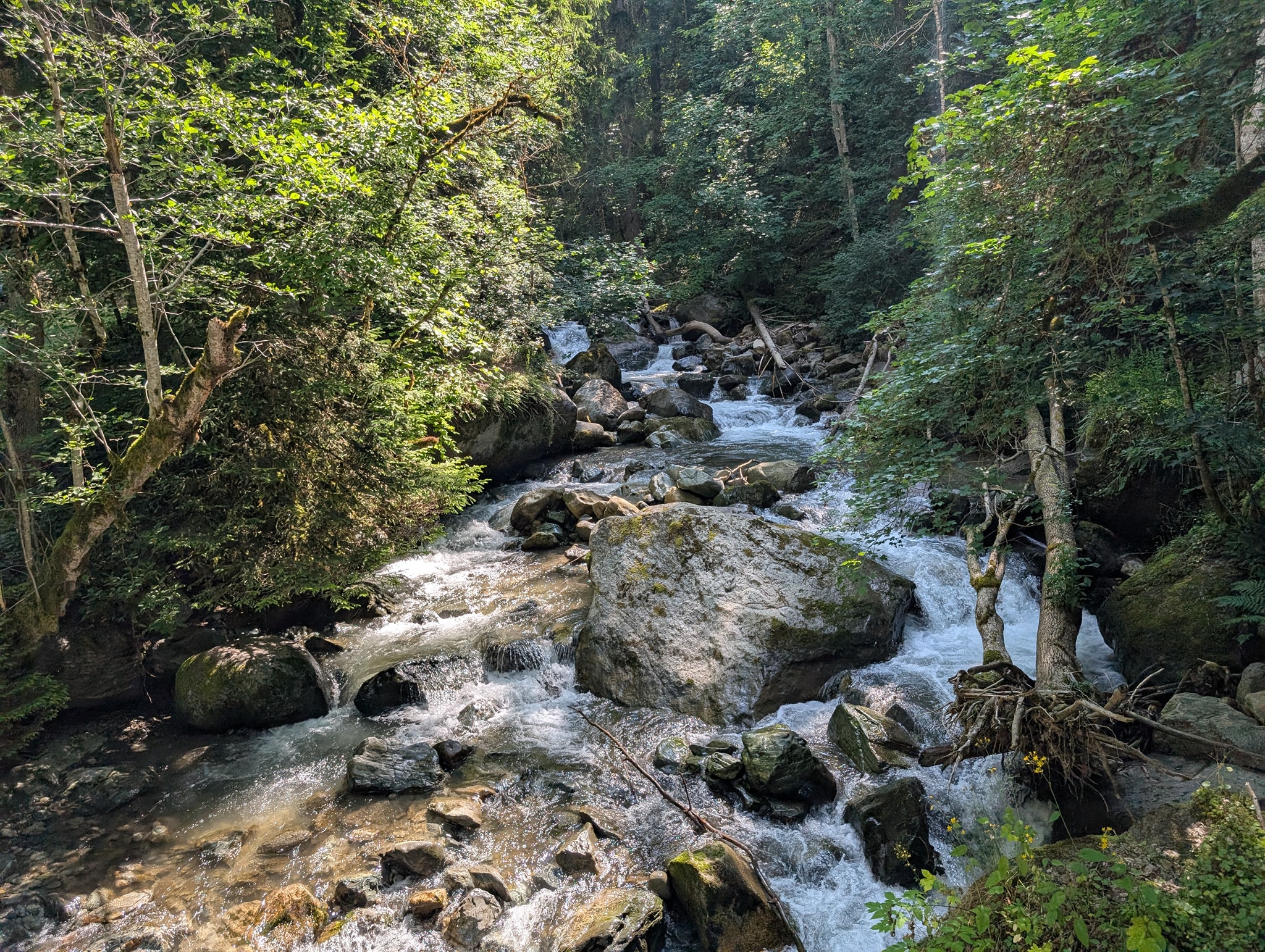 På vei ned møter jeg folk som er på vei opp til Lac du Muzelle. De jeg snakker med, spør alle om det samme: hvor langt det er igjen, og om det finnes vannkilder lenger opp. De har hatt en tøff oppstigning i varmen. Det blir betydelig varmere jo lenger ned jeg kommer, så jeg fyller vannflaskene hver gang jeg har mulighet.