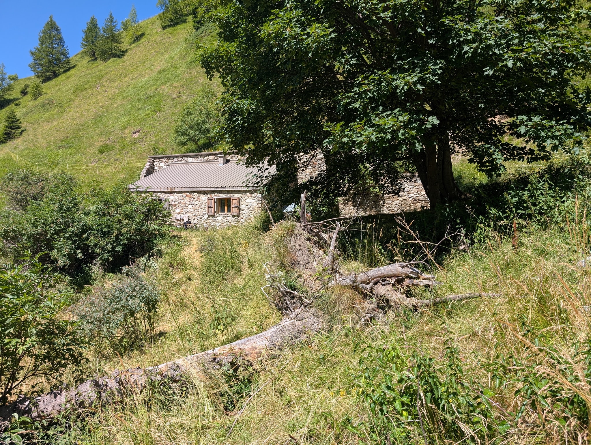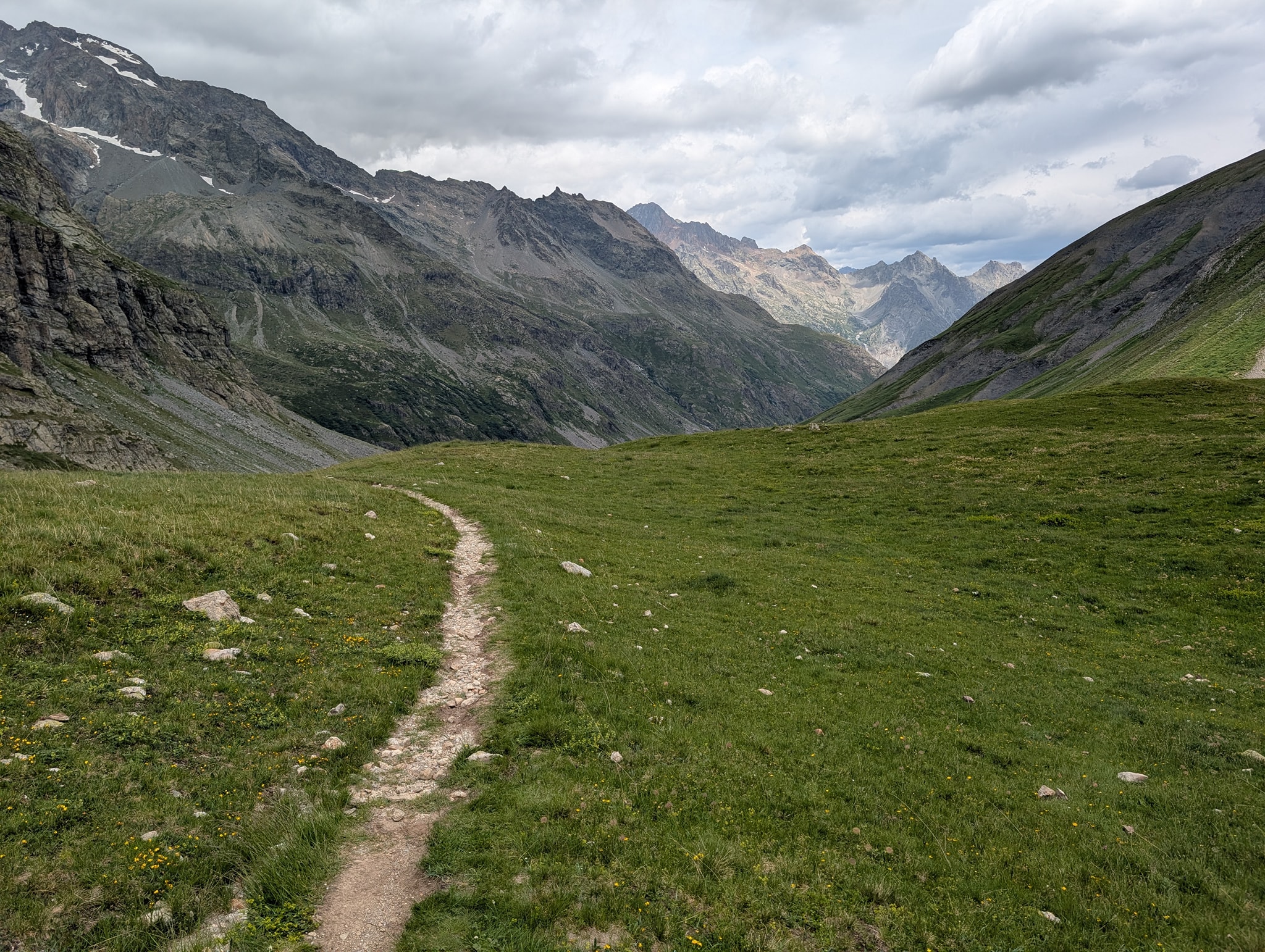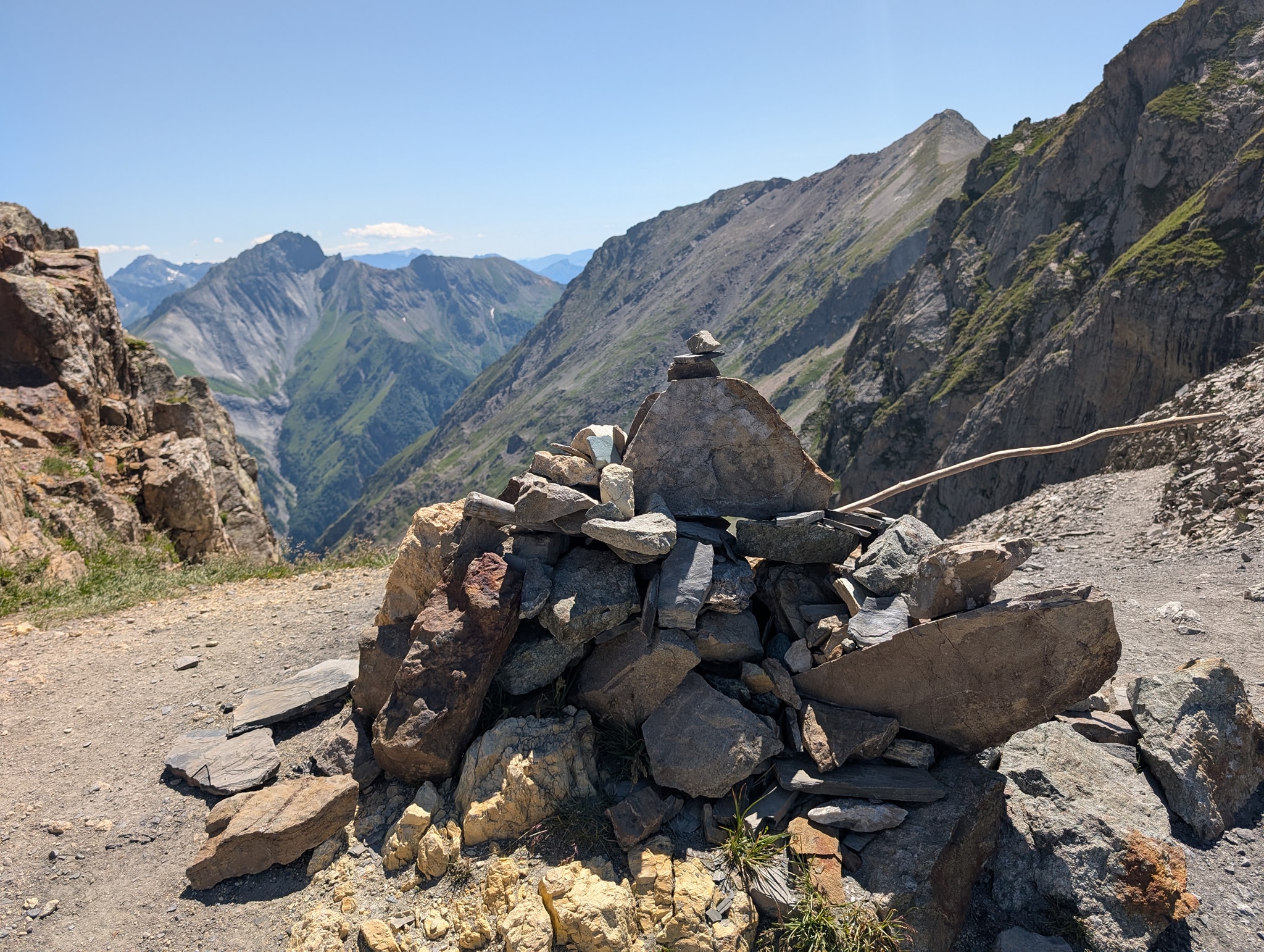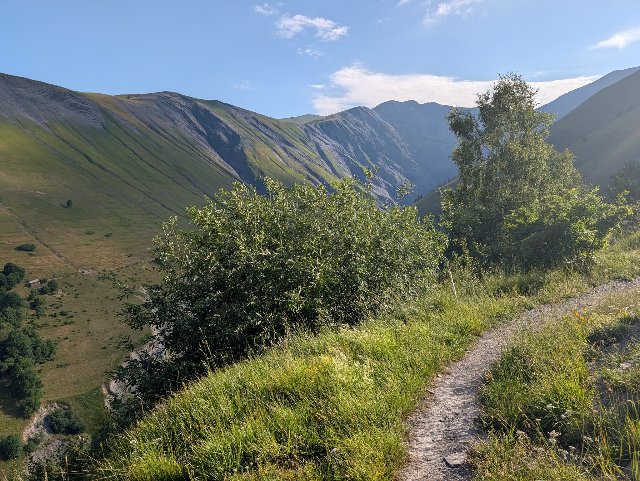 Også dagens etappe starter med bratt stigning. Solen tar godt nå, og temperaturen er 25 grader. Det er riktignok bare 400 meter stigning i dag, men det blir likevel tungt i denne varmen. Stien går i sikksakksvinger opp den bratte fjellsiden; i starten er det slakk stigning, men mot slutten blir det veldig bratt. Beina er fortsatt preget av gårsdagens etappe, og det blir svært tungt mot slutten av stigningen. Etter litt over en time når jeg toppen av passet, Col du Vallon (2546 moh.).