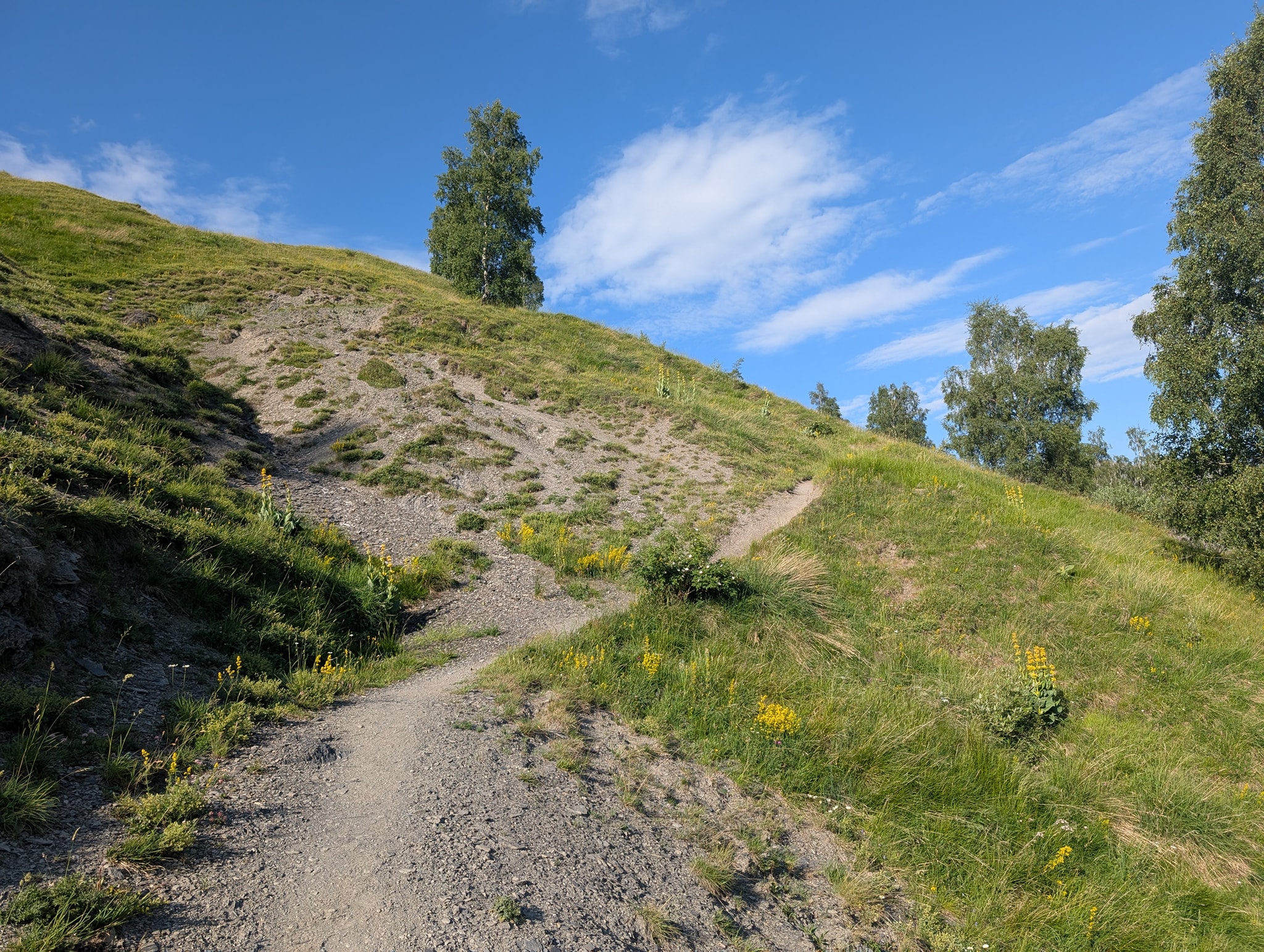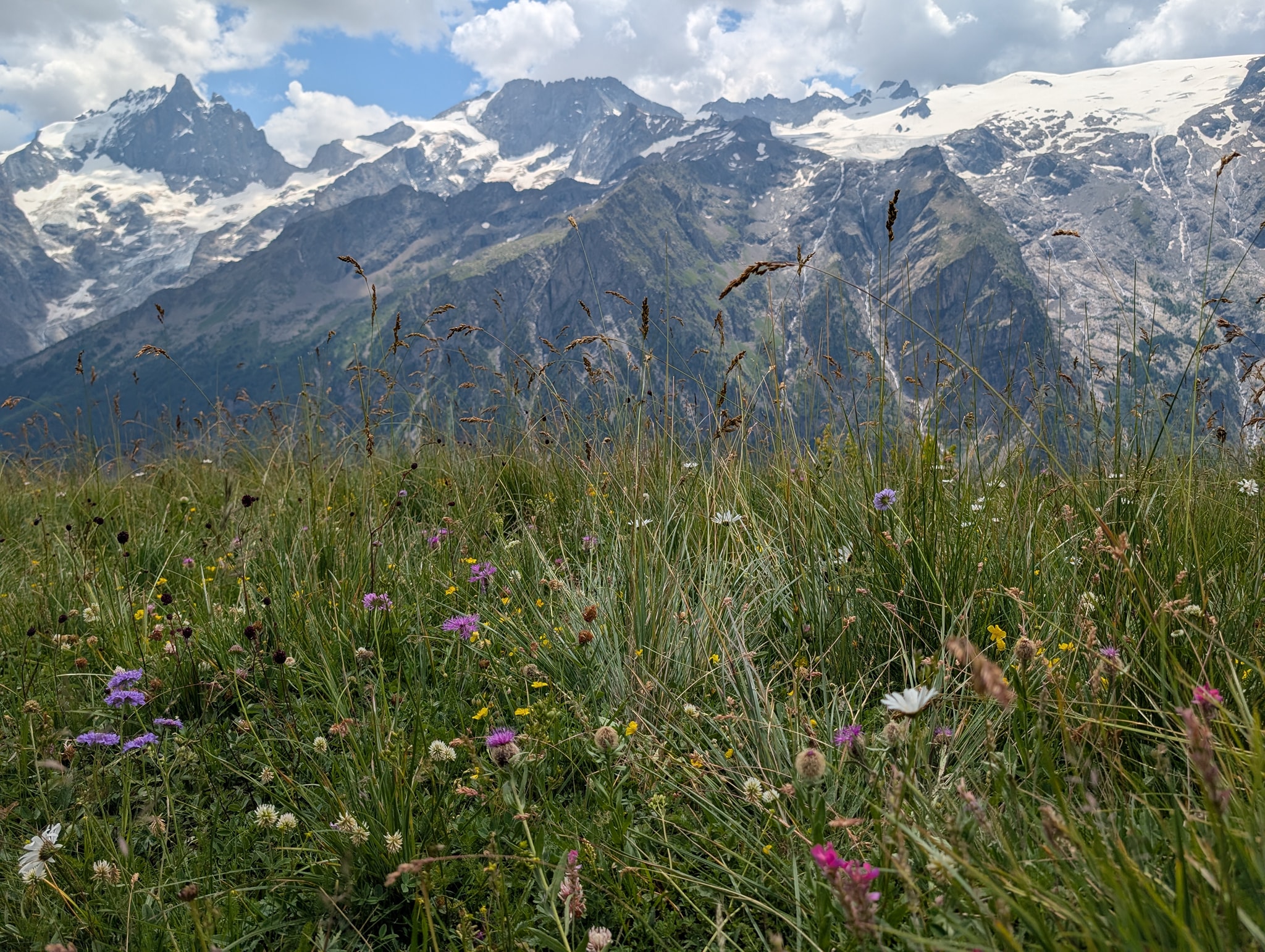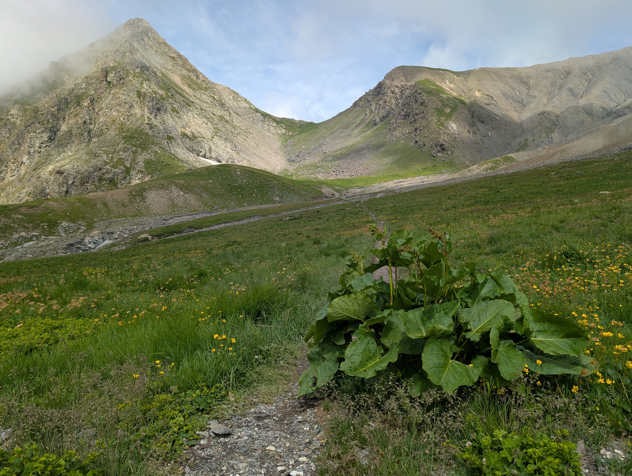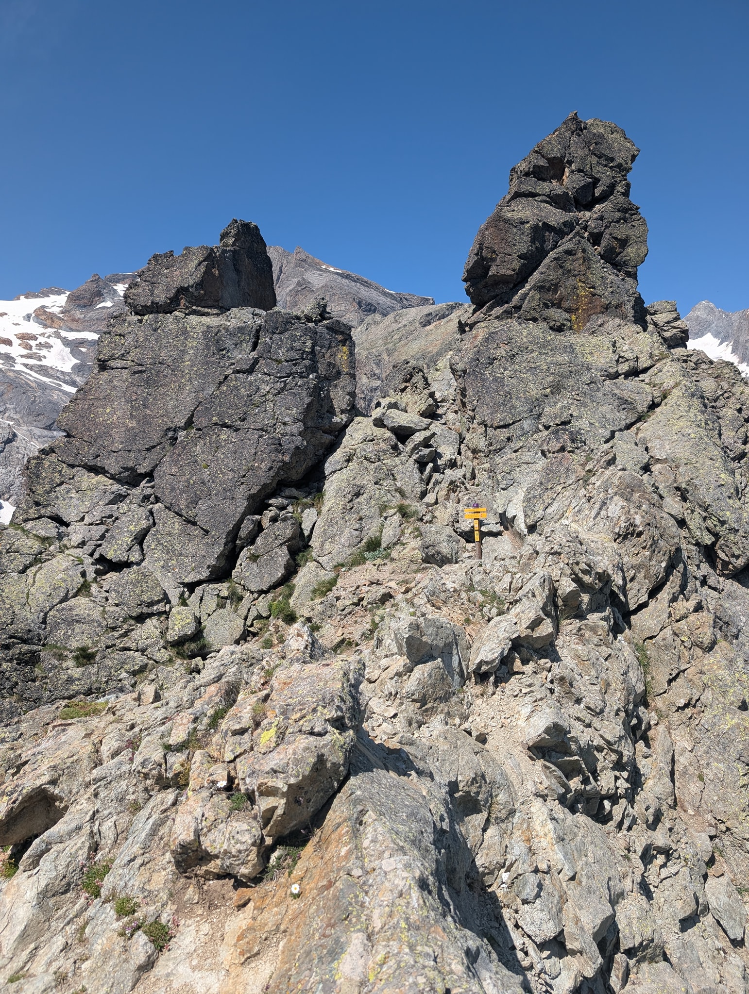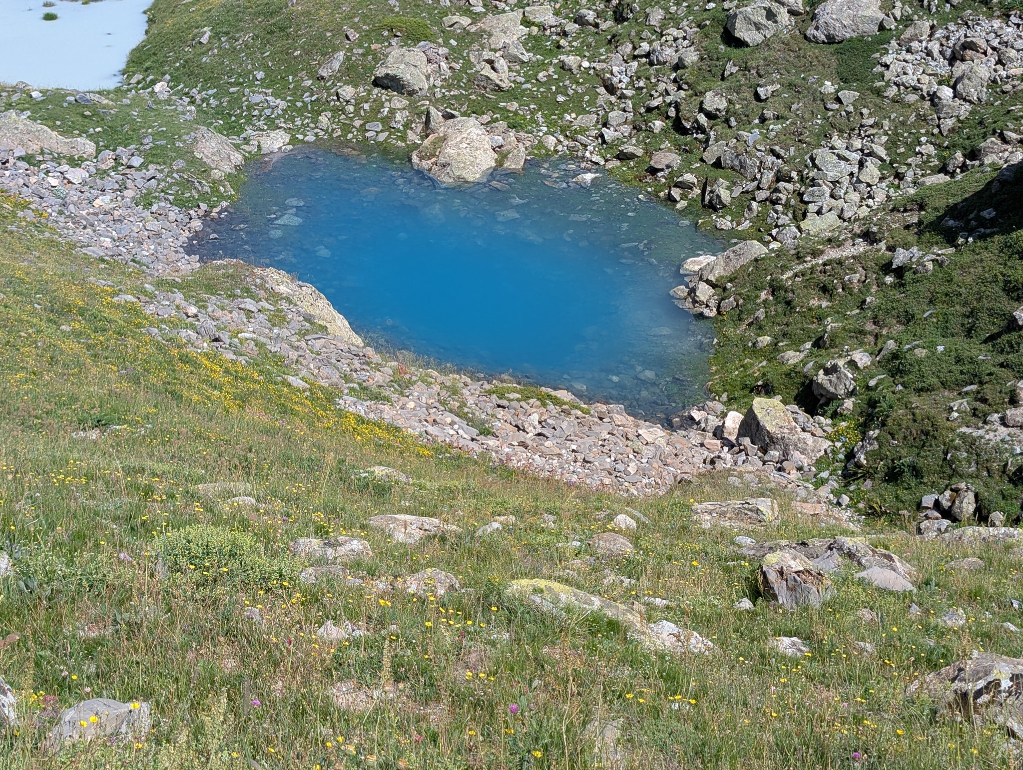 Også dagens etappe starter med bratt stigning. Solen tar godt nå, og temperaturen er 25 grader. Det er riktignok bare 400 meter stigning i dag, men det blir likevel tungt i denne varmen. Stien går i sikksakksvinger opp den bratte fjellsiden; i starten er det slakk stigning, men mot slutten blir det veldig bratt. Beina er fortsatt preget av gårsdagens etappe, og det blir svært tungt mot slutten av stigningen. Etter litt over en time når jeg toppen av passet, Col du Vallon (2546 moh.).