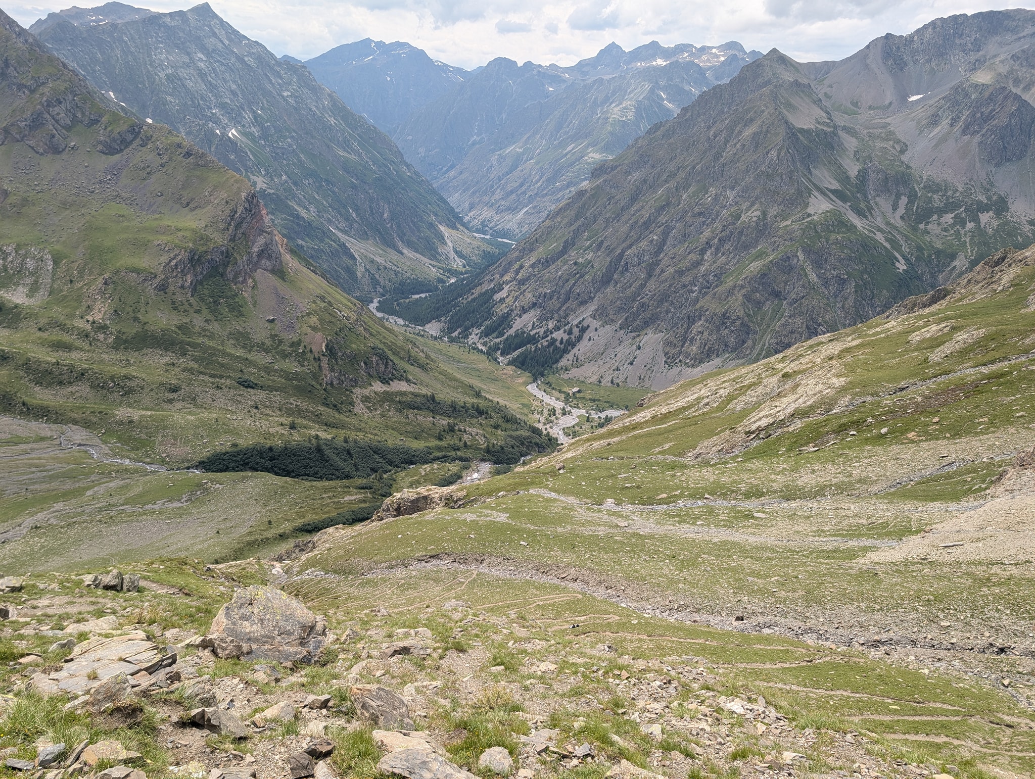 Når jeg fortsetter vandringen, merker jeg fortsatt smerter i dette kneet, så jeg prøver å bruke stavene for å motvirke belastningen. Dette gjør at tempoet går betraktelig ned. Etter hvert kan jeg se vannet, som er neste delmål, langt der nede under meg. Lenger ned i dalen kan jeg også se Le Bourg-d'Oisans. Det er et stykke ned dit, og jeg skjønner at dette kommer til å ta tid.