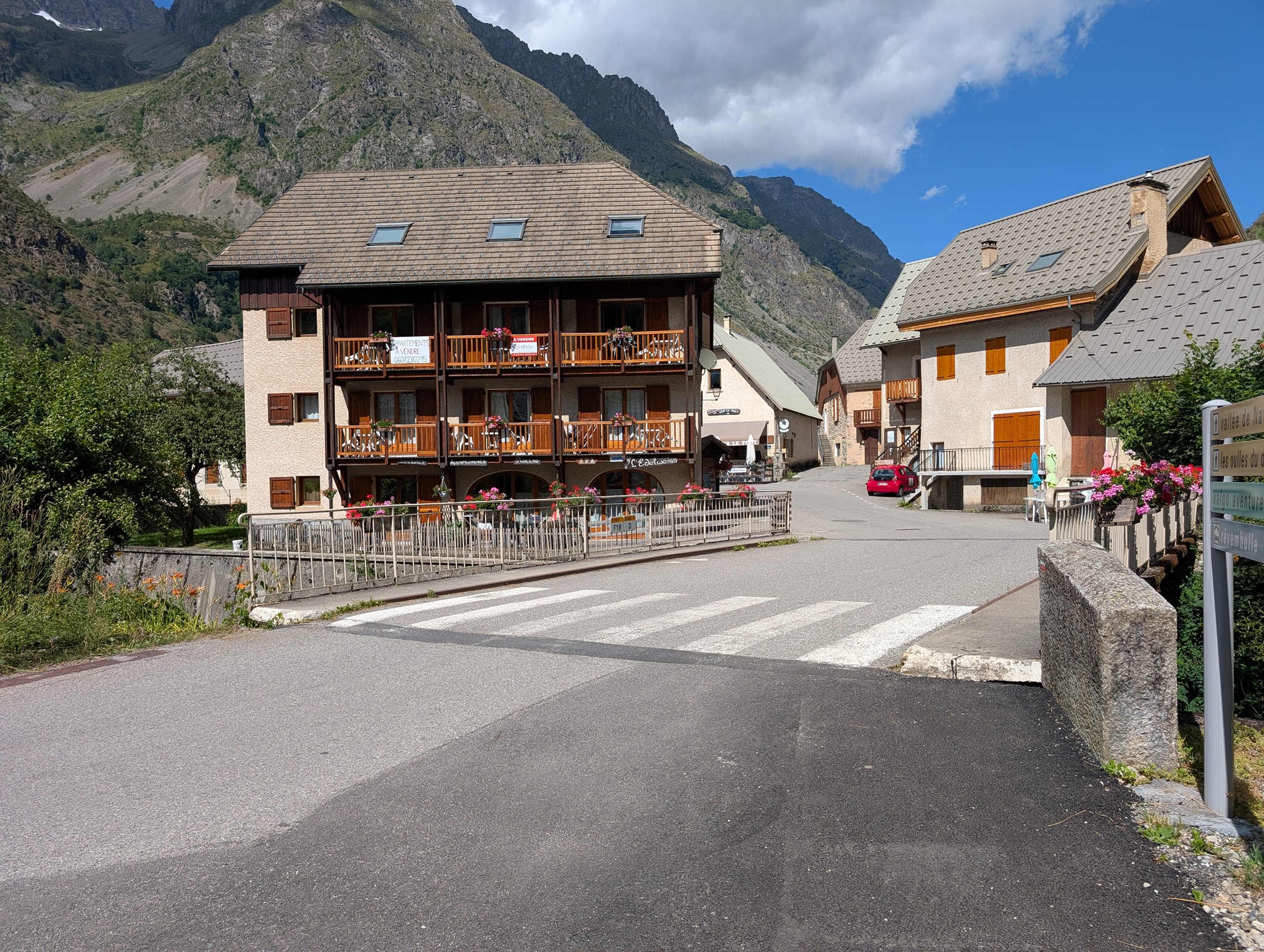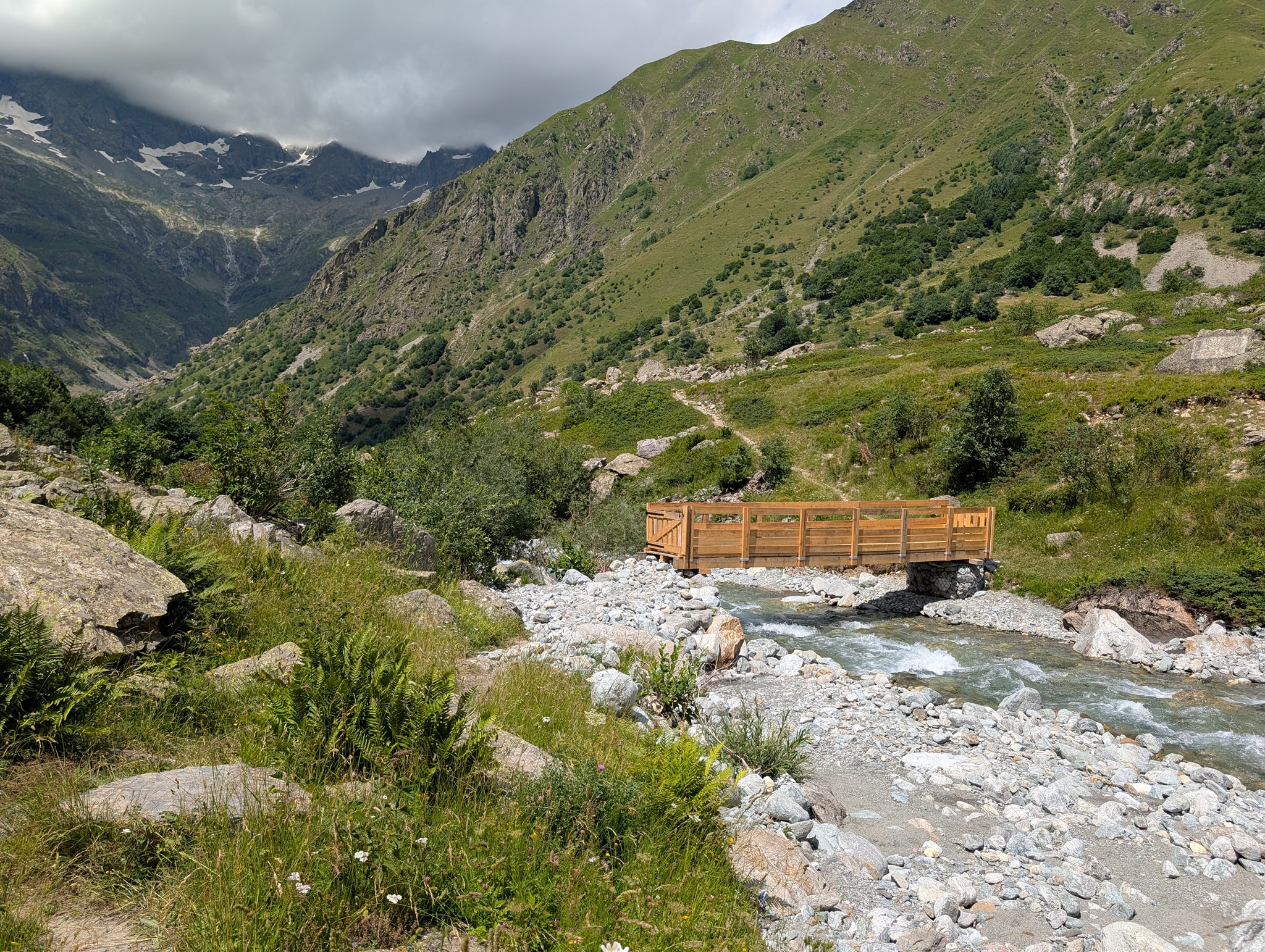 Det er nå 200 meter nedstigning igjen til Le Bourg-d'Oisans. Disse er fordelt på de 10 kilometerne som gjenstår av etappen, så de er knapt merkbare. Herfra følger løypen en vei helt frem til målet. På vei ut av grenden møter jeg Thomas, en tysker jeg har truffet flere ganger de siste dagene. Vi slår følge ned dalen og prater selvfølgelig om det vi har opplevd på denne turen. Det slår meg hvor likt vi tenker, vi som går denne turen. Nå hentes ideer og inspirasjon stort sett fra de samme kildene også: boken til Andrew McCluggage, de samme Facebook-gruppene og YouTube-kanalene. Det er kanskje ikke så rart likevel. Vi skiller lag ved vannet Étang du Buclet, hvor Thomas har tenkt å campe i natt. Jeg fortsetter de tre kilometerne som gjenstår frem til Le Bourg-d'Oisans.