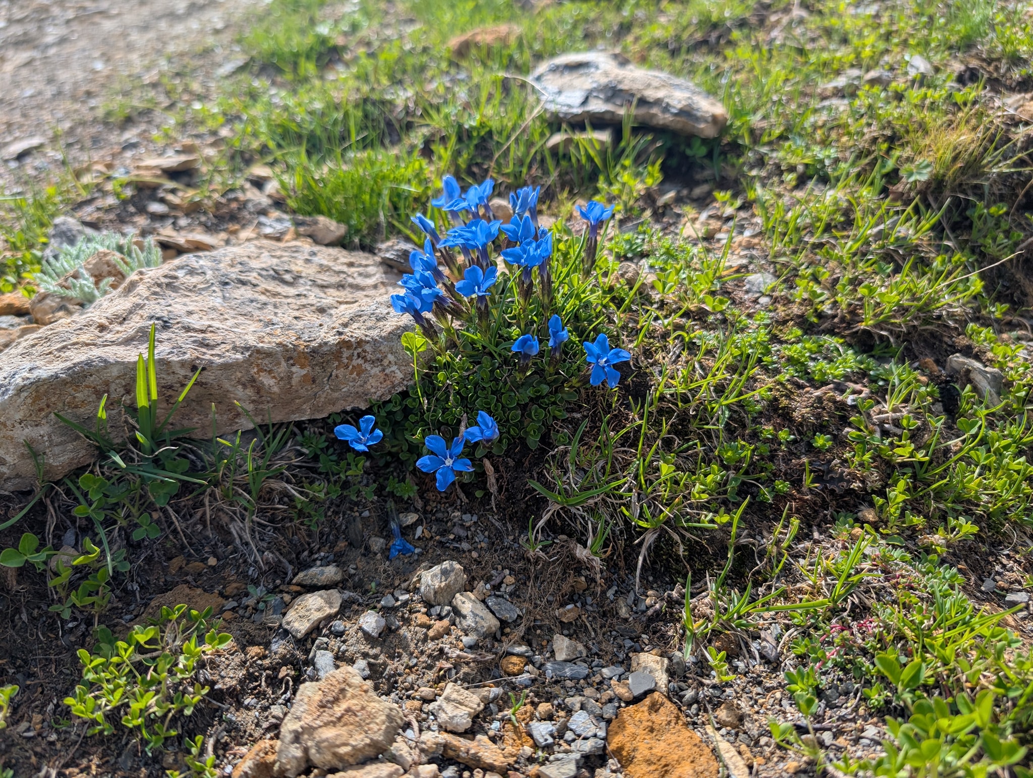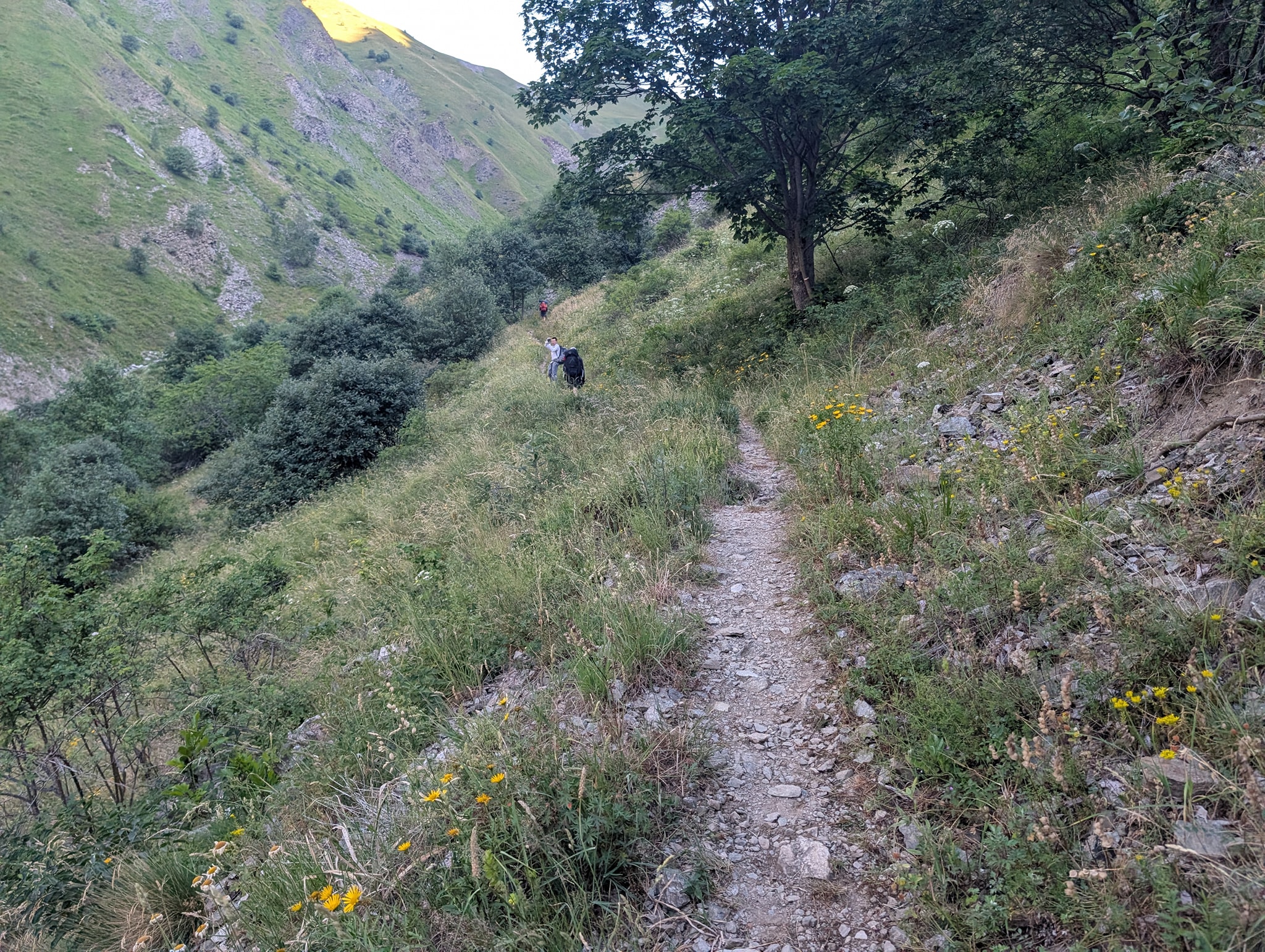 Første del av denne nedstigningen går på en sti som er lett å gå på. Etter hvert blir den mer steinete, bratt og enkelte steder veldig eksponert. Det er montert sikringsvaiere i de mest utsatte partiene. For første gang på denne turen mister jeg balansen og faller på den steinete stien med knærne først. Jeg klarer så vidt å ta meg for med hendene, slik at ikke resten av kroppen også deiser i bakken. Det blir noen saftige skrubbsår på leggene, og det verker i det venstre kneet som fikk hardest medfart.
