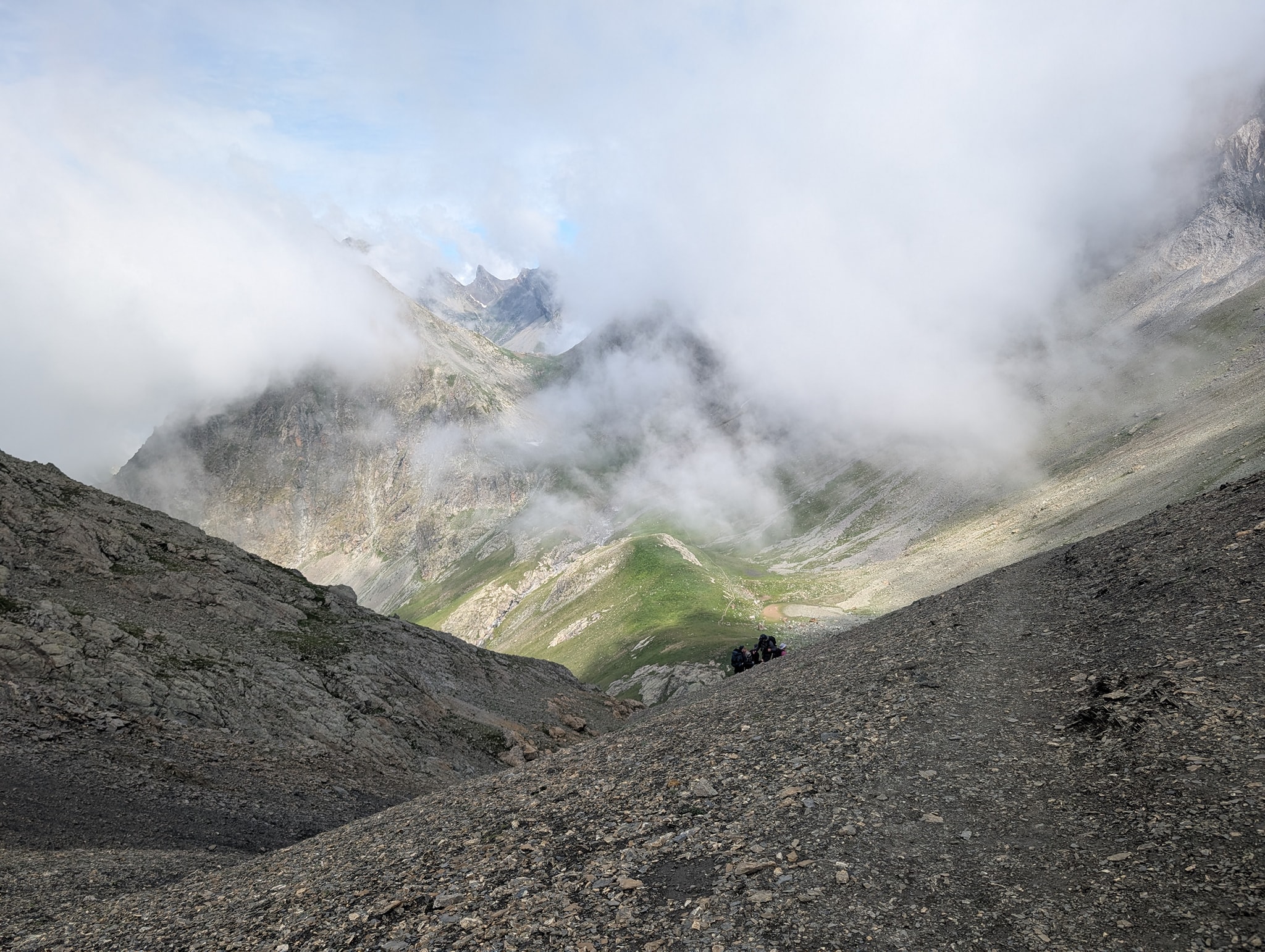 Det blir en liten pause her før jeg fortsetter ned på den andre siden av passet. Dagens mål, Le Bourg-d'Oisans, ligger på 720 meters høyde. Det betyr at jeg har ca. 1800 høydemeter med nedstigning foran meg. Først skal jeg ned til vannet Lac Lauvitel, som ligger på 1500 meters høyde.