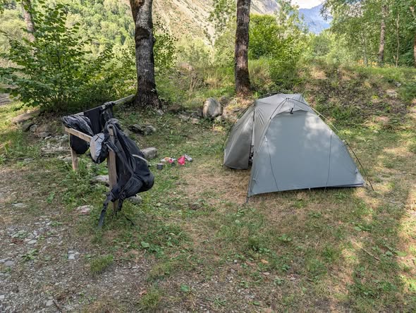 Ute har solen nå krøpet over fjellene og treffer fjellsiden på motsatt side av dalen. Teltduken er våt på utsiden også, så det har nok vært høy luftfuktighet i natt. Jeg ønsker å få tørket teltet før jeg pakker det ned for siste gang. Det vil ta en stund før solen treffer teltet, så jeg spiser frokost og pakker ned utstyret mens jeg venter. Klokken blir ti før jeg er klar til å gå. Det er bare noen få telt igjen på sletten nå.